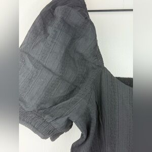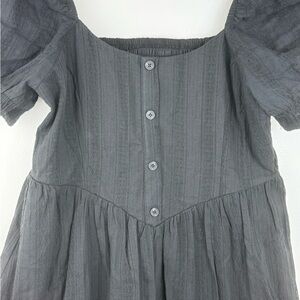 Chic black mini dress with puff sleeves. Zippered side. Button-up front adds a classic touch. Perfect for versatile styling.