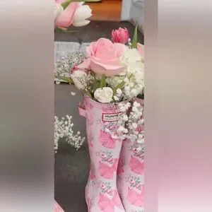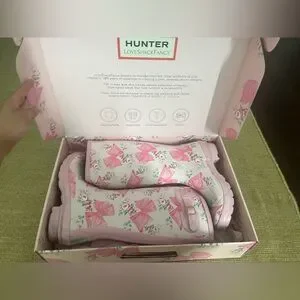 Elegant floral print rain boots featuring delicate roses and foliage. Soft pink base with detailed flower pattern. Classic Hunter logo patch adds signature style.
