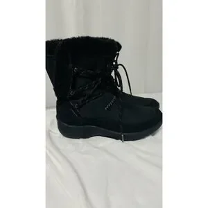 The Clarks Winter Boots Wave Walk in size 9.5 for women are a stylish and practical choice for the winter season. These black snow boots feature a waterproof leather upper and cozy faux fur lining, perfect for keeping your feet warm and dry in snowy weather. The Clarks brand is known for quality and comfort, making these boots a reliable option for cold and icy conditions. With their insulated design and durable outsole, these boots are sure to keep you comfortable and stylish all winter long.