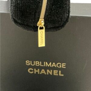 Chanel Sublimage set featuring a black pouch and towels with gold embroidery. Elegant and luxurious design.