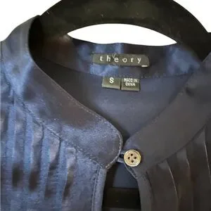 Gorgeous satiny stretch silk blouse from Theory. Mint condition! Beautifully cut with a finely pleated front with great drape in a deep, dark rich navy blue. 94% silk, 6% spandex. Size S. Questions? Leave a comment below!