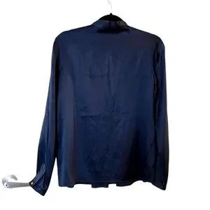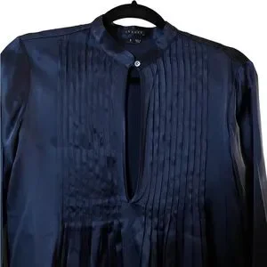 Theory Navy Blue Silk Pleated Front Long Sleeve Blouse