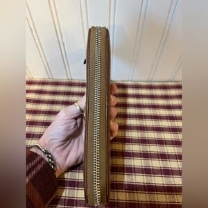 This classic beauty has been cleaned and conditioned. It’s classic D@B quality leather. Full zip around, no cracking in leather. There are some minor marks as shown in photos so please look carefully and ask questions before purchasing. 8 X 4” pebbled leather. Lots of CC slots, inside zipper coin compartment.