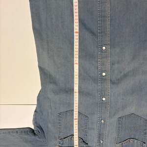Vintage 70s Wrangler Denim Western Shirt, Short Sleeve with an embroidered caterpillar smoking on mushrooms This unique piece features a custom chain-stitch style embroidery on the back of the smoking caterpillar on a mushroom. Pointed collar and pearl snap buttons throughout.