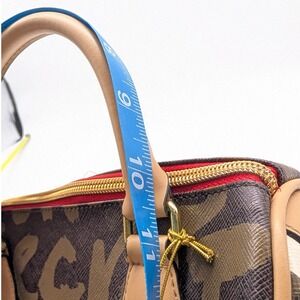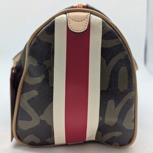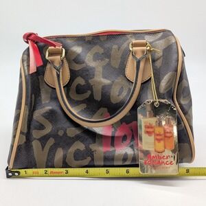 Victoria's Secret Amber Romance themed speedy style bag and cosmetic set. This structured handbag features a repeating logo pattern in neutral tones with pink accents and tan trim. It includes a top zipper closure, dual carry handles, and a vibrant red interior lining with a branded leather patch. The attached tag indicates it was once a set including a Hydrating Body Lotion, Refreshing Body Mist/Spray, and Exhilarating Body Wash in the Amber Romance scent. This bag would be perfect for a weekend getaway or everyday use.
