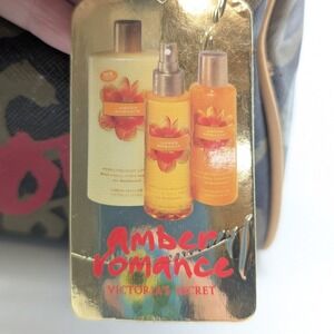 Keywords: Victoria's Secret, Amber Romance, Cosmetic Bag, Travel Bag, Logo Print, Satchel, Gift Set, Body Care, Fragrance, Designer Bag, Tote, Accessory Set, Pink Accent, Tan Trim