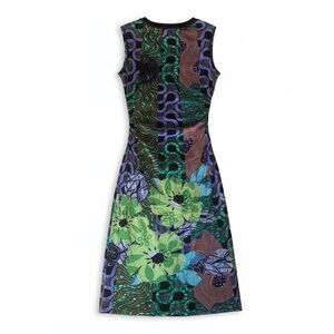 Stunning Kay Unger sleeveless midi dress featuring an abstract floral and swirl print in rich green, purple, brown, and black tones. Made from a layered mesh fabric with multiple layers, so it’s not see-through while still offering a smooth, stretchy, body-skimming fit.