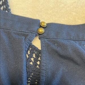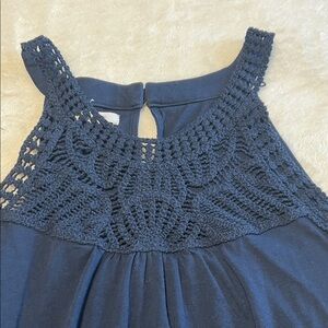 Elegant plus size navy blue sleeveless top with intricate crochet detailing. Perfect for a stylish and comfortable look.
