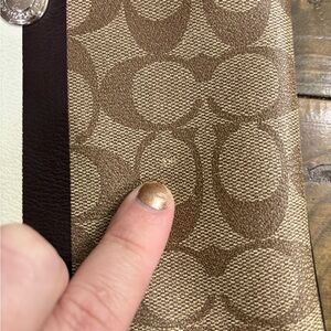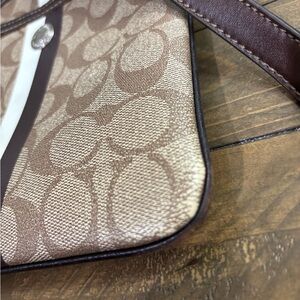 Stylish Coach crossbody bag. Features signature pattern. Tan and brown with white stripe. Adjustable strap for comfort.