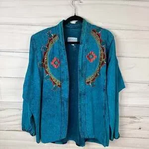 Vintage Sundance Hand Painted Southwestern Denim Jacket, Women's Size M — Unique wearable art in a vibrant teal acid wash.