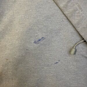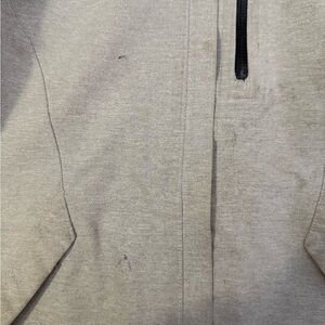 Light gray jacket with hood. Features The North Face logo. Ideal for outdoor wear. Not in pristine shape. There’s a tear in the arm and stains as pictured. It has been washed. Price reflects the cosmetic issues