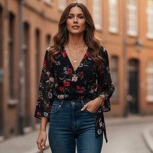 Chic black kimono/wrap blouse with vibrant floral design. Features striking red and green details.