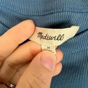 Keywords: Madewell, women's tank, blue tank, sleeveless, Supima cotton, ribbed texture, casual wear, versatile, stretchy, machine washable, pre-owned, medium size, solid pattern, summer top, layering piece.