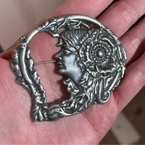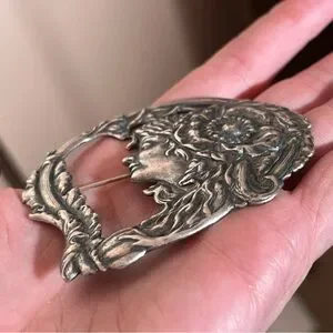 Antique Art Nouveau Art Deco Silver Lady Face Victorian Brooch vintage