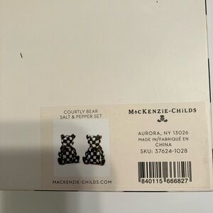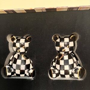Mackenzie Childs set of Courtly Bear Salt and Pepper Shakers coordinates with the black Courtly Check pattern. With gold accents. New in box protected by foam. Purchased at the Aurora store.