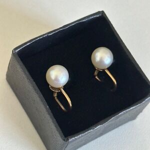 14K Solid Yellow Gold Genuine 7.5MM Pearl Vintage Screw Back Ladies Earrings