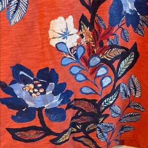Chico's 3/4 sleeve top with buttons on the cuff and vibrant floral design. Features orange base with blue accents. Perfect for casual wear. No flaws.