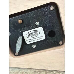 The underside retains original manufacturer labels, including copyright and patent information. The base includes protective feet and a mechanical wind-up key.