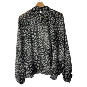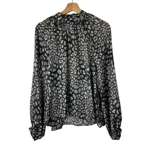 Worthington Dark Gray & White Leopard Print High Neck Long Sleeve Blouse M