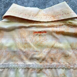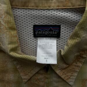 This Patagonia men's short sleeve shirt is in excellent pre-owned condition. It features a full-zip front, a single zippered chest pocket, and a unique topographic map print over a yellow gingham pattern.