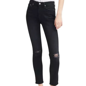 The jeans are Rag & Bone, “Nina High-Rise Ankle Skinny,” in a washed black color with distressing. Elevate your denim game with these Rag & Bone “Nina High-Rise Ankle Skinny” jeans in washed black. Featuring a flattering high-rise fit, stylish distressing on the knees, and a raw hem, these jeans are perfect for casual or edgy looks. Made with a soft and stretchy blend of material for all-day comfort. Previously worn see photos for condition details.
