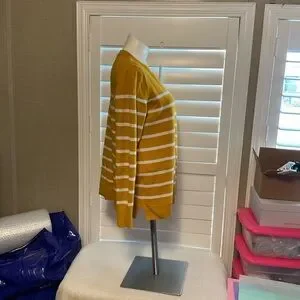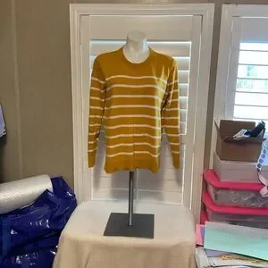 Cozy knit sweater with mustard and cream stripes. Ideal for layering.