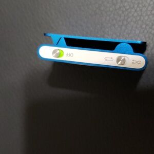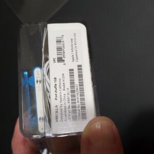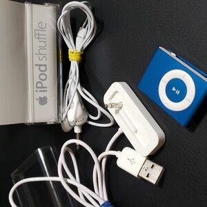 iPod Shuffle 2nd Gen 1 GB, turquoise blue. Clean, excellent condition. Original hard case, docking station, and ear phones. Charges and powers right up. I may have used this 3 times. It has lived in my desk drawer in the case for years.