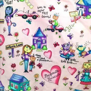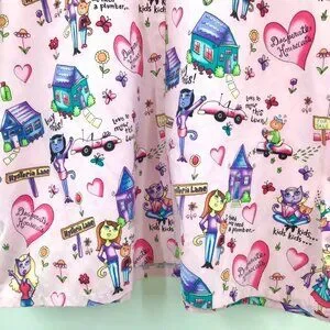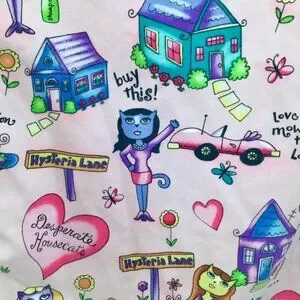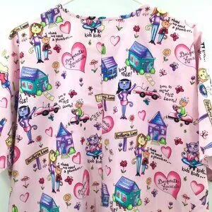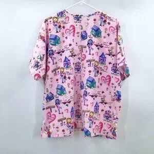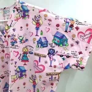 Adorable scrubs top featuring allover "Desperate Housecats" pattern with amusing, brightly colored print (see close-up photos). Two right front patch pockets, one left front patch pocket. Short sleeves, v-neck popover. The size tag has been removed; based on the measurements this should fit a 2X or possibly a 3X, but as always please compare your measurements with those below:
