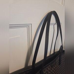 Stylish black and brown Tory Burch tote bag with matching pouch included. Pouch does not connect to anything inside bag. Minimal signs of wear on outside of bag, mostly on base of bag. Definitely signs of wear inside tote and pouch. Price reflects! See photos for details on signs of wear / condition. Outside of pouch and tote are still in good condition. Handles have minimal to no signs of wear. Zipper closure!