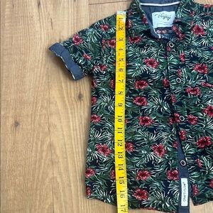 Embrace a vibrant look with this button-down shirt featuring a lively green and red tropical print. Crafted from lightweight fabric, it's perfect for casual summer outings. The short sleeves and resort-inspired design make it a stylish choice for warm weather.