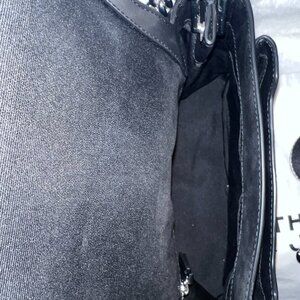 Crafted in smooth black leather with polished silver hardware, this bag features a structured silhouette and the iconic J Marc closure. What truly sets it apart is its dual-strap design: a sleek chain strap for a dressier look and a branded webbed crossbody strap for a more casual, street-style vibe.