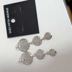 These are new Saks Fifth Avenue dangle earrings made of rhinestones. They are pierced earrings with a screw back closure and measure 1.5 inches in length. They are designed to be worn on the lobe and have a drop shape.