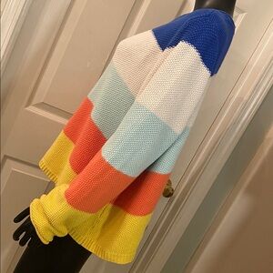 Vibrant sweater with bold stripes. Features blue, white, light blue, orange, and yellow. Perfect for a colorful look.