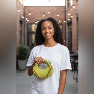 This mini bag features a vibrant green hue complemented by a striking gold chain detail. Its compact crescent shape and soft material make it a stylish and practical accessory for any occasion.