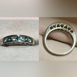The Five-Heart Vow Ring: A one-of-a-kind 1970s talisman of lineage and legacy. This 1970's Natural Emerald and Diamond Heart Ring is a vintage piece crafted with 925 sterling silver. The stunning design features a round green emerald as the main stone, accented with sparkling diamonds. The heart shape cutouts adds a romantic touch to the promise, engagement, anniversary, cocktail, eternity, or band style ring, making it an ideal birthday gift for a loved one. The custom-made ring in approx. size 7.5 exudes elegance and classic charm, perfect for those who appreciate timeless beauty and quality craftsmanship. Natural emeralds and diamonds alternate across a sterling silver band, each stone cradled above a heart-shaped cutout. Suspected untreated Colombian emeraldsβunconfirmed but radiant.