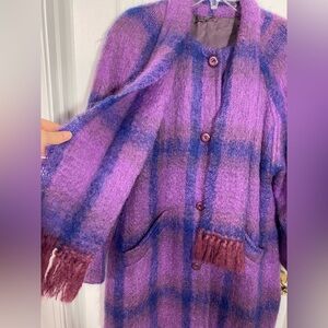Vintage Donegal Ireland Handwoven Pure New Wool Mohair Plaid Scarf Coat Purple L