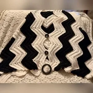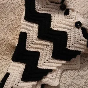Hand Crochet Black and White Chevron Knit Shawl with Buttons
