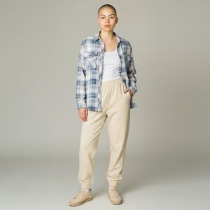 Soft 100% cotton with a washed blue/tan plaid pattern.