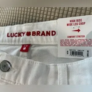 New with tags Lucky Brand High Rise Wide Leg Crop jeans in classic white. Features a flattering high-rise waist, modern wide-leg cropped silhouette, and comfortable stretch denim. Finished with functional front and back pockets and clean hems—perfect for spring and summer outfits.