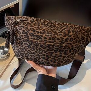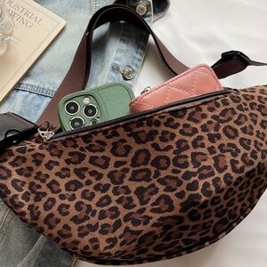 Stylish women’s faux leather leopard print crossbody bag with adjustable strap. Perfect for casual outings. 3 pockets - main pocket, front pocket both have stylish zipper pulls, also a back pocket, having space for all of your belongings. Brand new in packaging. Measures 13 x 8 inches.