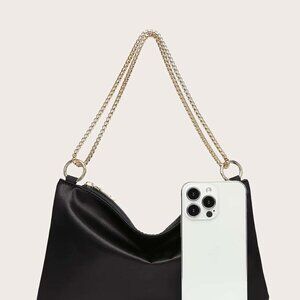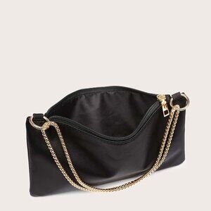 Features: Beautiful satin finish and soft lining give this square bag a luxe feel. It has a sleek zipper closure and a sturdy metal strap, making it perfect for adding a touch of glam to any outfit.