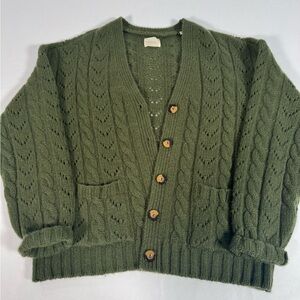 Cozy green cable knit cardigan with button closure. Features two front pockets. Cashmere and wool.