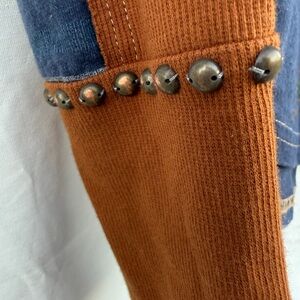 Features a detailed western graphic with cowboys and cattle. Blue base with orange sleeves. Embroidered detail makes this shirt extra special. Just too big for me.