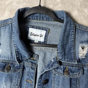 One-of-a-kind statement denim jacket by Between Us featuring an artistic, hand-painted-style portrait on the back. This jacket has a perfectly distressed finish throughout with a raw frayed hem for an edgy, lived-in look.