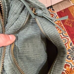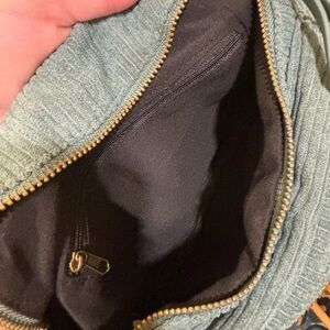 Stylish blue corduroy bag perfect for any occasion. Features a unique design with convenient zippers and a comfortable strap.