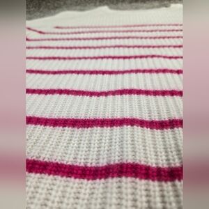 Stay cozy and stylish with this striped white and pink sweater. Perfect for any casual outing.