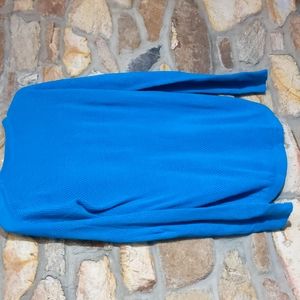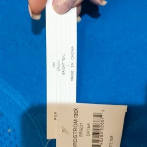 NEW WITH TAGS! Purchased at Nordstrom Rack. Size Large. Bright blue/teal, color is true to first photo. This cozy relaxed fit open stitch sweater features crew neckline cut with open stitching on the sides, sleeves, back and angled to the front in a bright teal turquoise color. Material is Acrylic. See photos for more details and approx measurements.