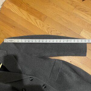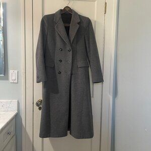 Dark gray long wool overcoat. Vintage Mister Coats for Her by David Baker. Union Made in U.S.A - Amalgamated Clothing & Textile Workers Union. Double Breasted. Notched collar.
