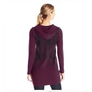Beautiful prAna Misha Duster knit hoodie in a rich black plum / deep burgundy color. This versatile piece features a full zip front, hood, and a striking mandala-style graphic on the back that gives it a boho, yoga-inspired feel. Designed in a flattering long duster length, perfect for layering over leggings, jeans, or activewear.
