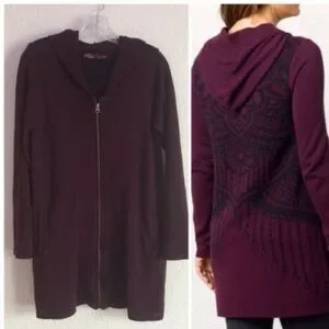 prAna hoodie, Misha duster, zip up hoodie, organic cotton sweater, boho hoodie, yoga sweater, long knit cardigan, burgundy hoodie, plum sweater, eco friendly clothing, meditation graphic, athleisure layer, women’s large hoodie